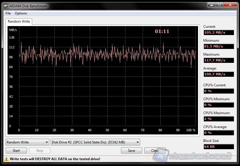 In lettura, l'SSD di Silicon-Power si comporta molto bene, in scrittura, nel test di AIDA i risultati non sono stati esaltanti. Come abbiamo già detto, generalmente è un comportamento comune a tutti gli SSD che adottano questo controller SandForce, il quale con dati non comprimibili presenta un decadimento delle prestazioni.